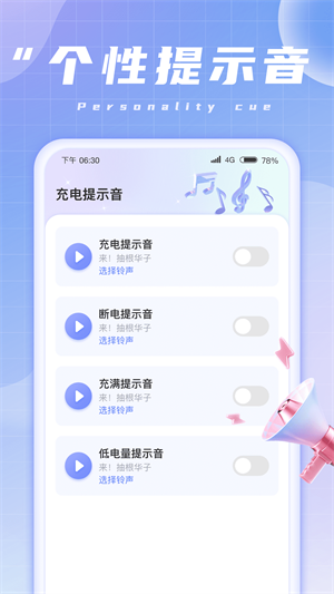 - 超丰富的个性充电提示音在线设置,根据自己喜好来设置,满足你个性需求。