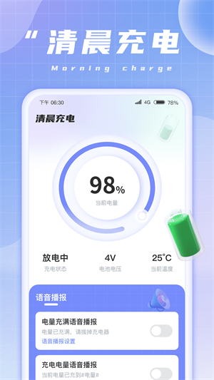 清晨充电是一款手机充电工具,可以设置充电动画,根据不同充电状态下进行语音播报,专为老年人打造贴心服务,随时随地选择你喜欢的充电动画,开启个性提示音,让每一次的充电都更加便捷,轻松掌握手机电量。