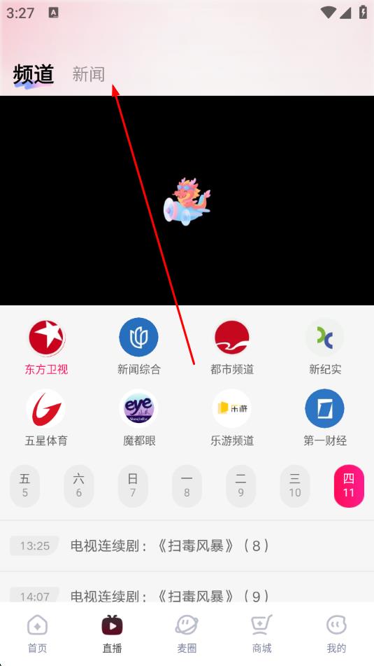 2、进入直播页面后,点击上方的新闻栏目。