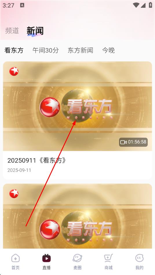 3、在新闻栏目下,找到看东方节目,点击想要观看的回放视频封面。