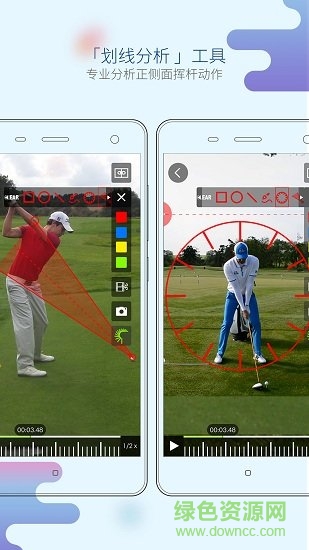 可以通过高尔夫打球在视屏界面上 绘制线 ,圈,矩形,量角器,刻度盘实现对动作的指导;