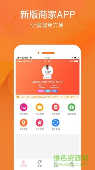花嫁商户店铺管理工具,帮助商户更加高效便捷地处理订单、管理会员、核销卡券、沟通客户、管理应用等。