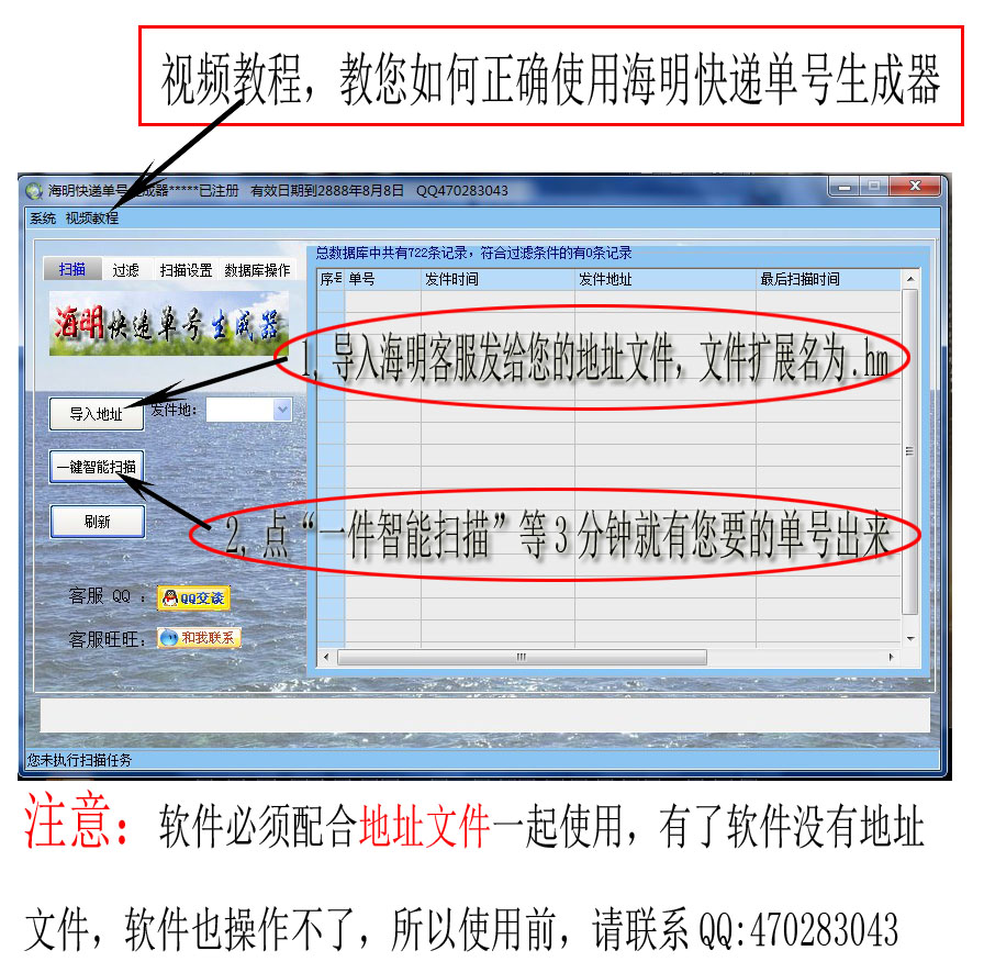 海明快递单号生成器,于2010年4月份上市,软件至今一直能够正常使用;本软件是市场上唯一一款能够生成当天单号的生成器,软件无需固数,运用本团队开发的独创的智能扫描技术,两步操作+3分钟,能够生成几百个最新单号;生成的单号绝对真实,并且每天更新,这点是其他单号生成器都无法实现的功能