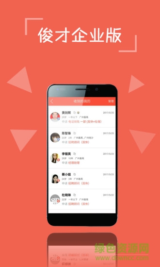 俊才招聘,全面面对企业招聘,更专业的企业招聘版,让企业更加多元化的招聘,更体贴企业的需求。移动招聘,随时随地浏览简历,应聘人员资料。快速发布职位,修改职位,一切将与网页同步。更精细化的图形简历赛选功能,学历,年龄,行业,经验。