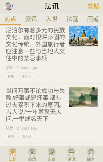 2. 进入“法讯”界面,了解佛法状况,聆听大师教诲,根据内容设有四大板块,分别为“资讯”、“入世”、“法筵”以及“问道”;