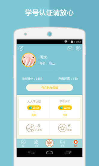 采用了人人网认证、学号认证等机制,通过认证的用户将提升信用等级,并且显示认证信息。