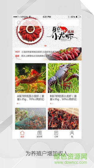 龙虾馆端:再也不用天没亮就去批发市场挑虾进货,再也不用货比三家讨价 还价,只要在家里动动手指就可以轻松下单,完成小龙虾食材采购,原产 地养殖户直供,最新鲜的货源,最优惠的价格,最便捷的配送。