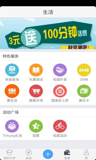 2、通过“生活”提供校园生活服务,如:校园外卖、找家教、翼讯卡充值、积分商城、周边商家、跳蚤市场等。