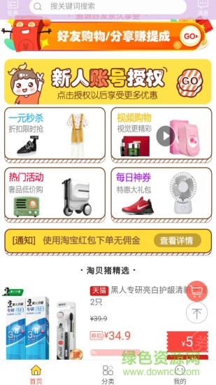 淘贝猪是一款超省钱的线上购物app,淘宝优惠券查找在线购物直接满减,精品好货推荐物美价廉。快来绿色资源网下载体验吧!