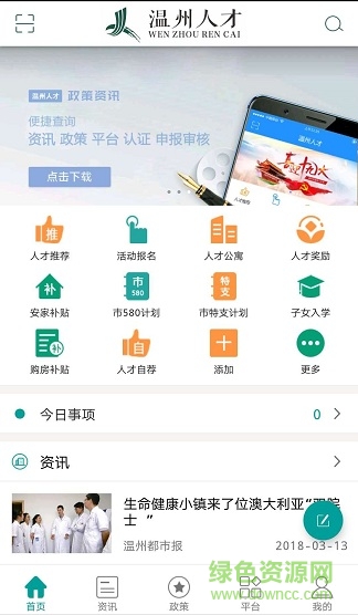 温州人才app是一款集人才引荐、政务办公等服务功能于一体的手机办公软件。为政府工作人员提供了便捷的民生互动服务。方便市民在线了解人才市场最新动态!快来绿色资源网下载使用吧!