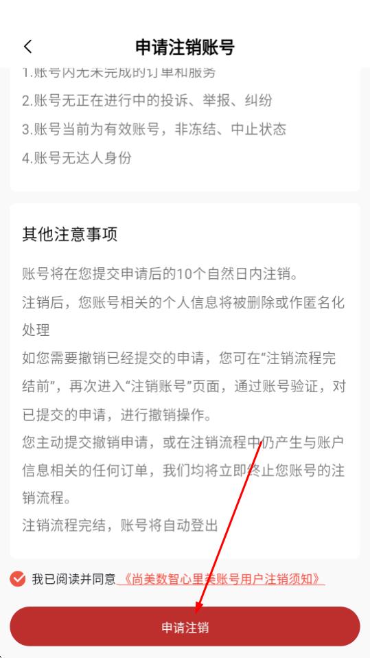 6、接着阅读注销须知,勾选我已阅读并同意《尚美数智心里美账号用户注销须知》,点击申请注销,即可完成心里美酒店会员账号的注销。