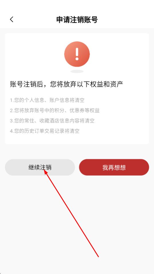 5、在申请注销账号页面,仔细阅读账号注销后放弃的权益和资产说明,点击继续注销。