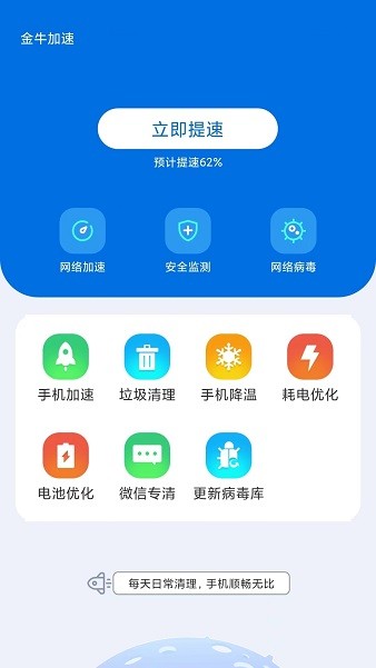 金牛加速工具包含了多种实用的功能,像耗电优化、网络加速、电池优化、微信专清等等都很贴合大家的需求,同时应用内的病毒库也会定期更新,能够帮助大家识别出更多病毒木马,让你的手机时刻处于安全的运行状态。