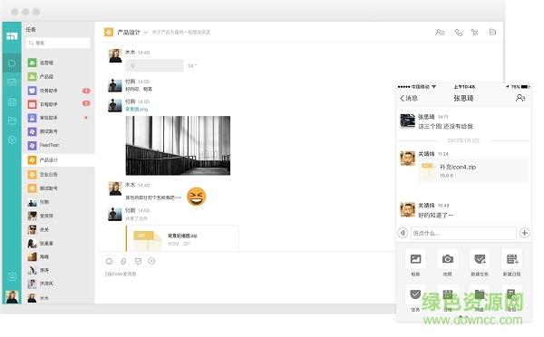 专门为工作场景打造的企业沟通工具,消息历史永久在线保存,发送格式化的文本片段,与任务、日历、网盘之间打通,在沟通中随时创建任务。