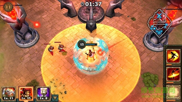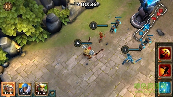 这是一款制作精良的动作游戏,游戏混合了众多dota和lol要素,战斗方式自然是指挥这些英雄去推塔。在游戏中玩家一共可以控制三个不同的英雄,通过左下角的英雄头像图标(这里还会显示英雄的hp和xp),可以实现快速的切换控制。而右侧则是每个英雄的技能快捷按键,一共有四个。直接点击就能触发技能,直接发动或者需要手动选择释放位置。技能使用会有冷却时间,在技能快捷栏图标的下方会显示冷却时间。另外,底端中间是各种道具的快捷栏,买了道具之后就能在这里点击使用哦!