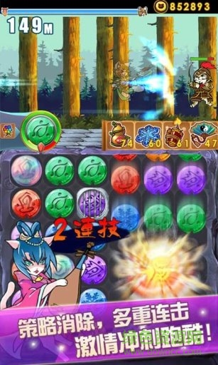 2、将符石消除和跑酷游戏的完美结合,简单粗暴的操作方法,分分钟让你停不下来!!策略消除,多重连击,体验全新的激情冲刺吧!