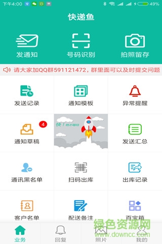 快递鱼app是一款专门为快递工作服务的手机短信服务软件,用户可以使用该软件批量发送短信通知,还支持号码识别,拍照留存等等功能,随时可以查询发送记录,各种通知模板都有,功能比较齐全,为快递服务提供方便!