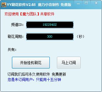 YY刷花软件是魔力团队工作室推出的刷花工具,可以帮助你免费刷花,同时支持挂机刷花,输入YY频道ID、设置好刷花周期,就能挂机免费刷花,很方便,欢迎下载使用!