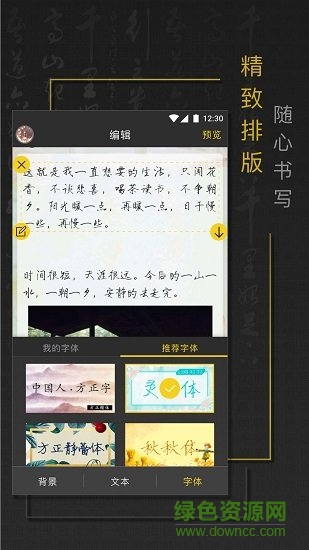 手迹秀秀app是一款多功能的手机字体处理软件,能帮助用户免费制作手写字体,丰富的趣味贴图,多样的文字效果,全面满足你的各类图文需求,操作简单易上手,有需要者快来绿色资源网下载吧!