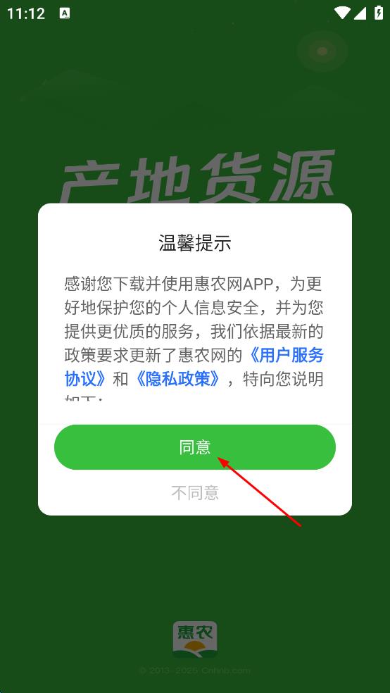 1、打开惠农网APP,在弹出的温馨提示框中,点击同意。