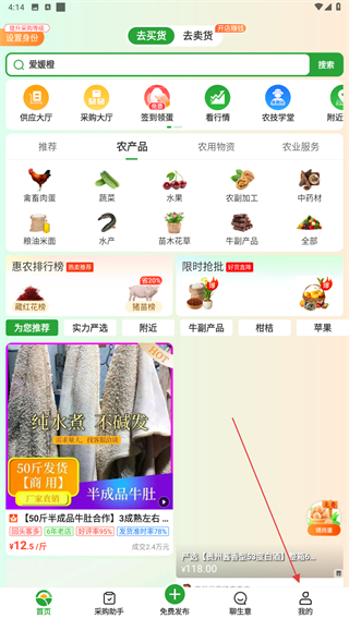 1、打开惠农网应用,在首页导航栏中点击我的图标。