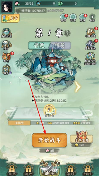 1、打开飘渺儒仙游戏,在第1章界面点击开始战斗,消耗体力进入关卡。