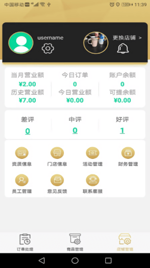 对店铺的日常进行管理,含有查看评论,员工管理,财务管理等子功能。