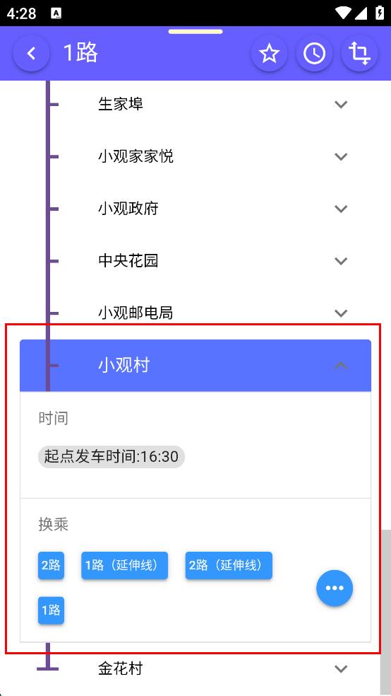 4、继续在1路公交详情页面,向下浏览,能查看各站点信息,包括小观村等站点的发车时间、可换乘的公交路线等内容。