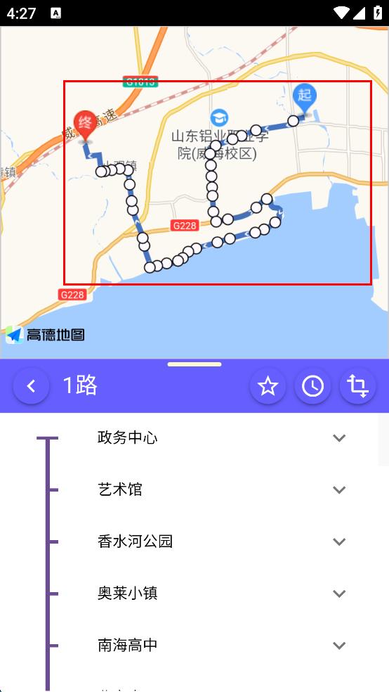 3、在1路公交详情页面,可查看该公交的行驶路线地图,地图上会显示起点、途经站点以及终点的位置分布。