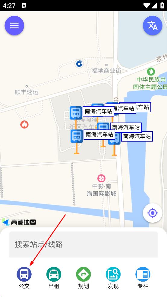 1、打开公交查询软件,进入地图页面后,点击底部的“公交”选项,进入公交线路页面。