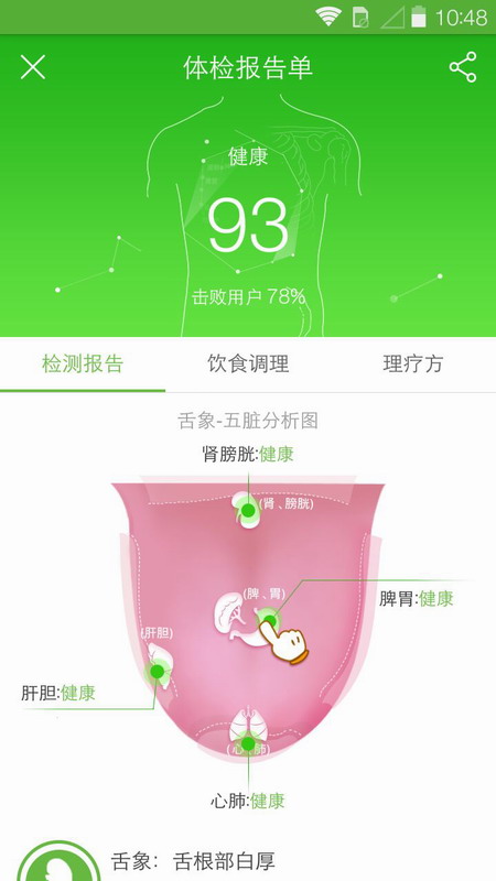 手机摄像头扫描舌头进行五脏亚健康体检,操作简单。