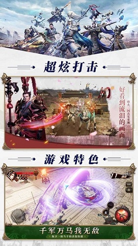 专业的美术团队倾心为广大玩家打造了逼真的三国主城场景,200多个独具特色的武将技能,200多种不同品质的装备,主线副本以地图形式展现,每个章节都有着各自的时代背景,高度重现三国历史!