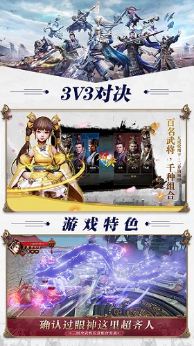 诸葛亮,刘备,张飞,关羽,吕布等武将全新再现,人物形象纤毫毕现,技能特效别具一格,让你爽快征服时代,打造属于自己的历史!