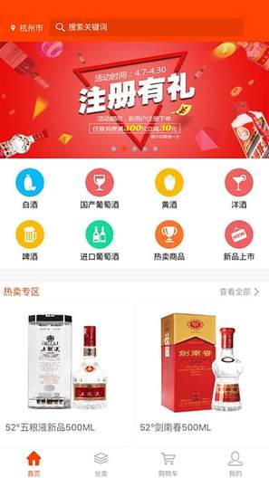 一键注册,酒币红包任性送;新客户首单满300立减30;满额赢名酒