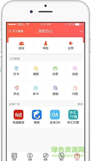 天下融通app是一款非常实用的手机智能办公软件,利用这款软件可以快速的规划办公的内容,加强对企业业务的管理,查看员工的信息以及考勤诸状况,还能直接利用这款软件在线开会,软件还会帮你记录开会重要的事项,让你办公更加具有效率性,感兴趣的用户朋友欢迎来绿色资源网下载使用。
