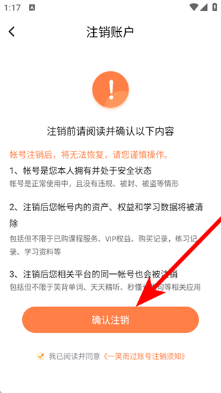 4、在注销账户说明页面,点击确认注销,完成账号注销操作。