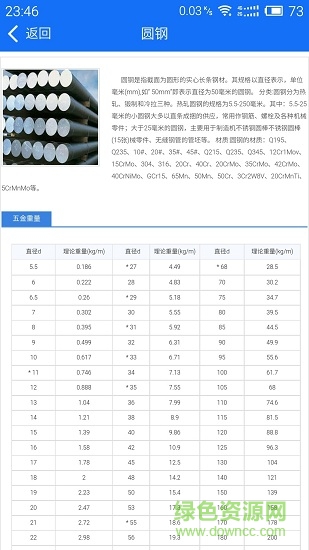 提供建设行业常用五金材料理论重量、规格、密度、计算公式、市场价格等信息。提供:圆钢、方钢、六角钢、八角钢、螺纹钢、圆盘条、等边角钢、不等边角钢、普通工字钢、轻型工字钢、普通槽钢、轻型槽钢、扁钢、薄钢板、中厚钢板、花纹钢板。。。。。100多种钢材理论重量。