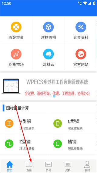 1、打开蓝光五金手册,点击底部导航栏的重量选项。