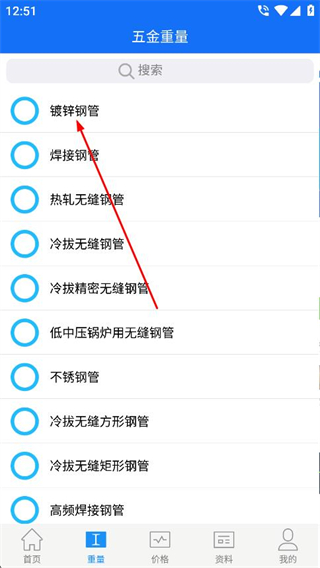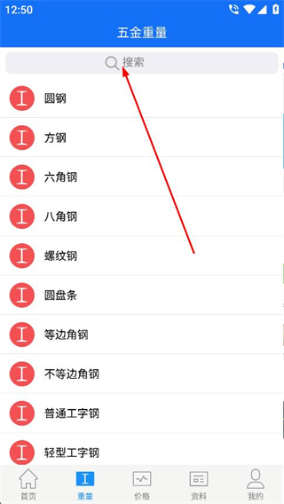 2、在五金重量页面中,点击搜索框,进入搜索页面。