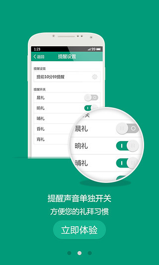 用户可以选择自己最喜爱的唤礼声音,可以在正点,提前5、10、15分钟提醒穆斯林预备进行礼拜。