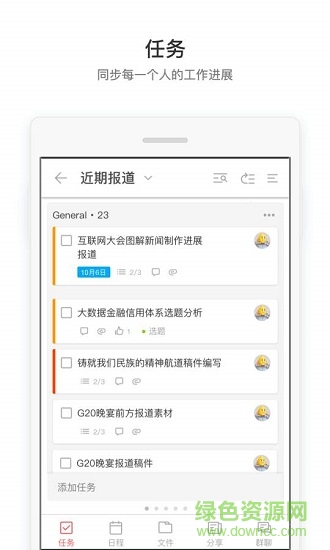 任务:每一个任务都可以是一个新闻线索或采访活动,任务卡片详情包含完整的新闻卡片信息,使任务的推进更具指导意义,即采,即编,高效的完成关键信息的传输、录入,通过任务卡片提供的的评论区可以定向或共同讨论,实现前方记者和后方编辑互动,保证新闻的时效性。