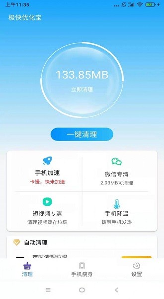 极快优化宝官方版作为手机优化清理的系统工具,不仅拥有简约的界面,强大的功能,操作起来也特别简单,可以帮助用户快速清理手机中的文件信息垃圾,一键优化加速运行,控制后台应用,节省电量,上网更加轻松方便!