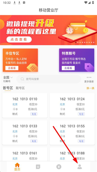 1、打开丰信移动营业厅app,点击底部导航栏我的选项,进入我的移动营业厅页面。