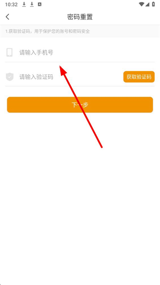 4、在密码重置页面,输入注册手机号,获取验证码后,点击下一步,按提示完成密码重置。