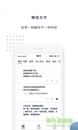 2、精简的交互操作,文字与配图融合,在留光,你可以发现与收藏这些你有所触动的句子;