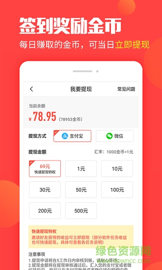 每日赚取的金币,可当日立即提现