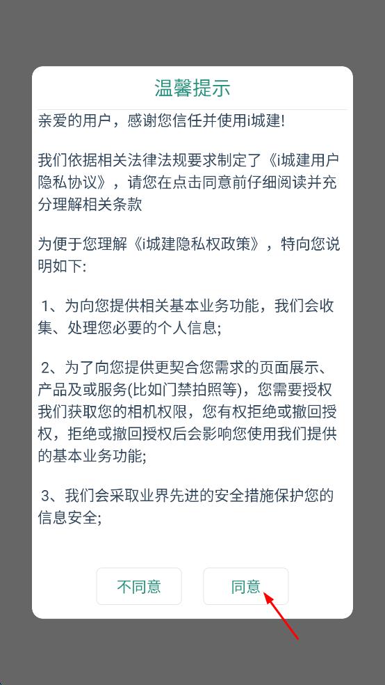 1、打开“i城建”APP,弹出隐私协议温馨提示,仔细阅读后,点击“同意”按钮,进入登录界面。