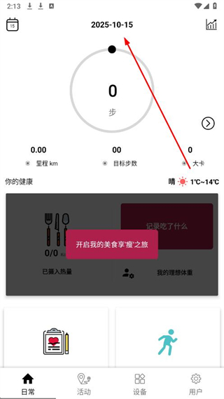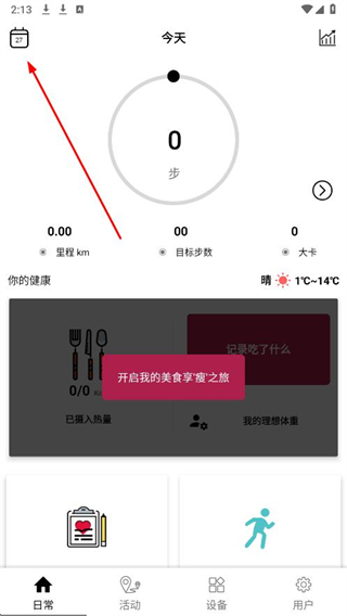 1、打开WellGo手环APP,点击左上角的日历图标。