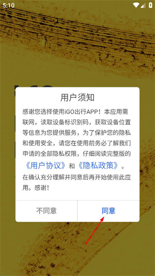 1、打开iGO出行APP后,阅读用户须知内容,点击页面中的同意按钮,完成该步骤的操作。