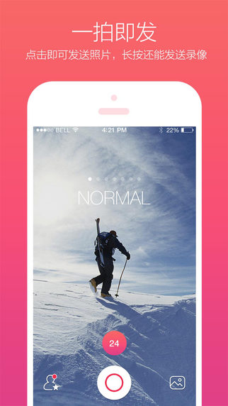 点击即可拍摄一张照片随机发送给身边的100位陌生人,长按拍照按钮还可录制10”短视频发送,就是这么快。